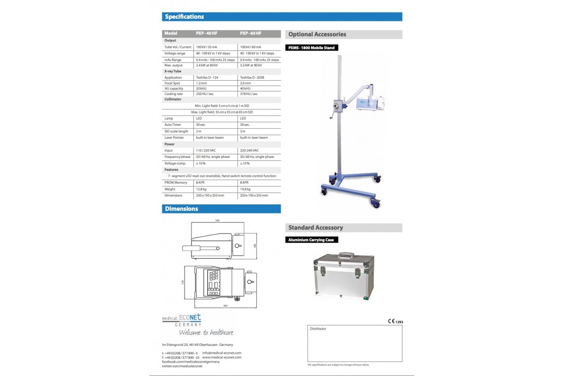 Το φορητό ακτινολογικό μηχάνημα είναι τελευταίας τεχνολογίας του Γερμανικού οίκου Econet Medical ενώ ο τύπος της λυχνίας είναι ο PXP-60HF με όλα τα πλεονεκτήματα της νέας τεχνολογίας, με χαμηλές δόσεις ακτινοβολίας καθώς είναι υψίσυχνη.